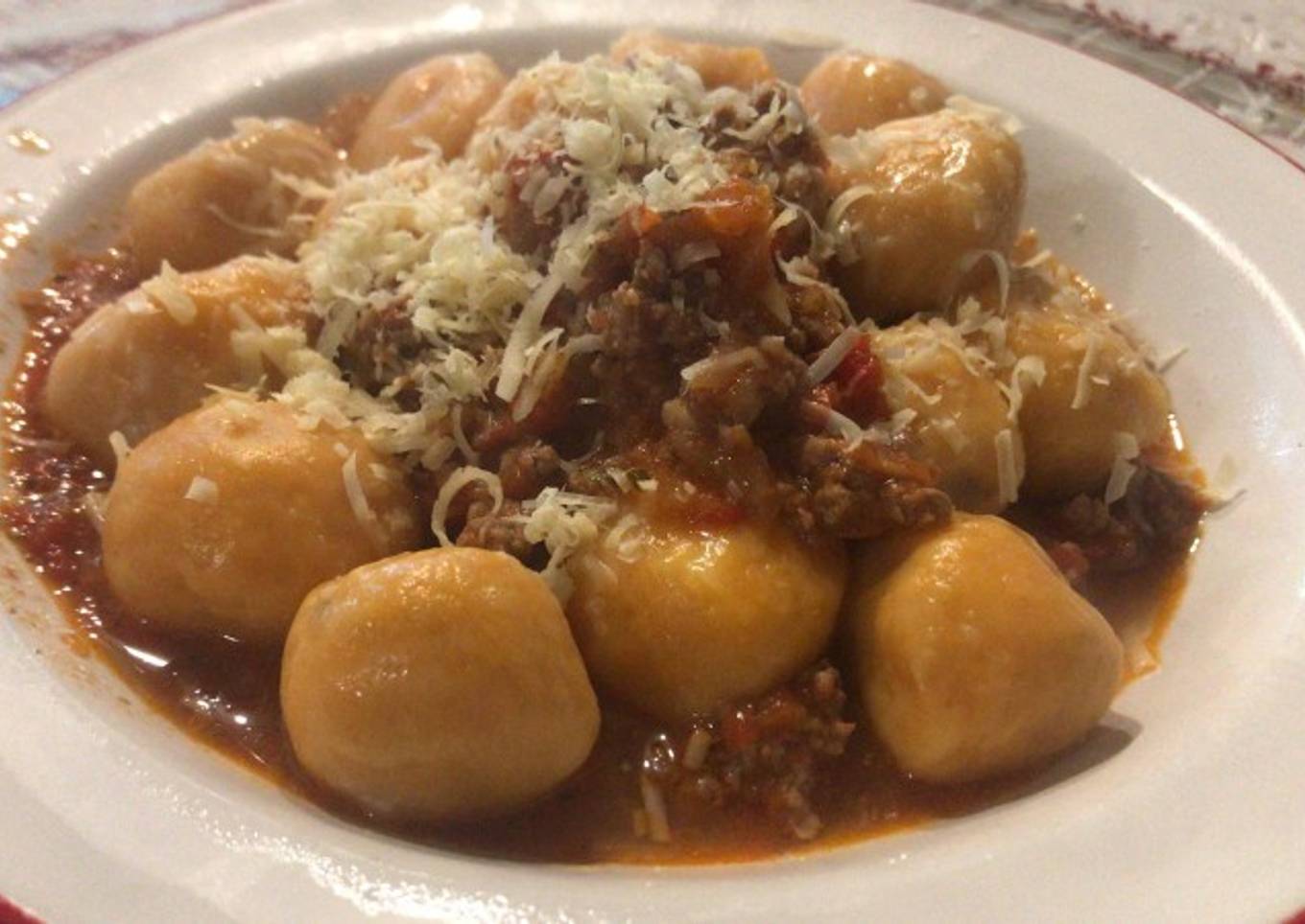 Ñoquis de batata rellenos con muzzarella y salsa bolognesa