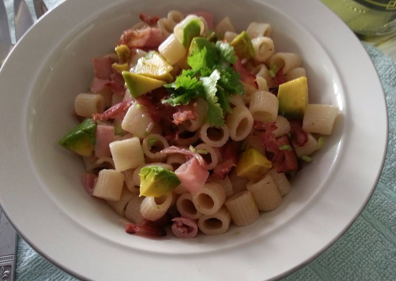 - Agrega a la pasta la tocineta y el jamón, los vegetales en aceite de oliva, cilantro picadito y mezcla todo muy bien. Luego los cubos de aguacate, más aceite de oliva y el queso rallado.