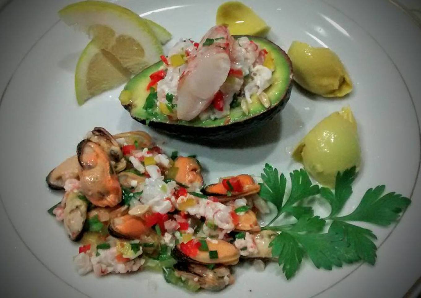 Aguacate relleno de ceviche de langostinos y mejillones
