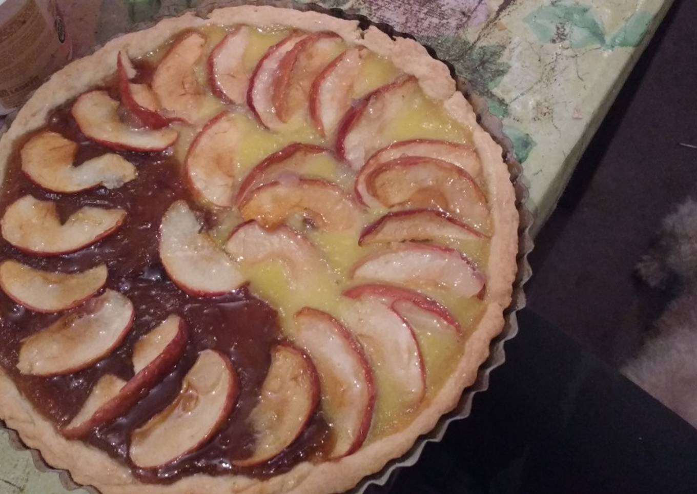 - Enmatecar la tartera y enharinar ponemos la masa la estiramos le colocamos el relleno luego las manzanas en forma de abanico y al horno a fuego moderado por 30 minutos o hasta que se doren los costados